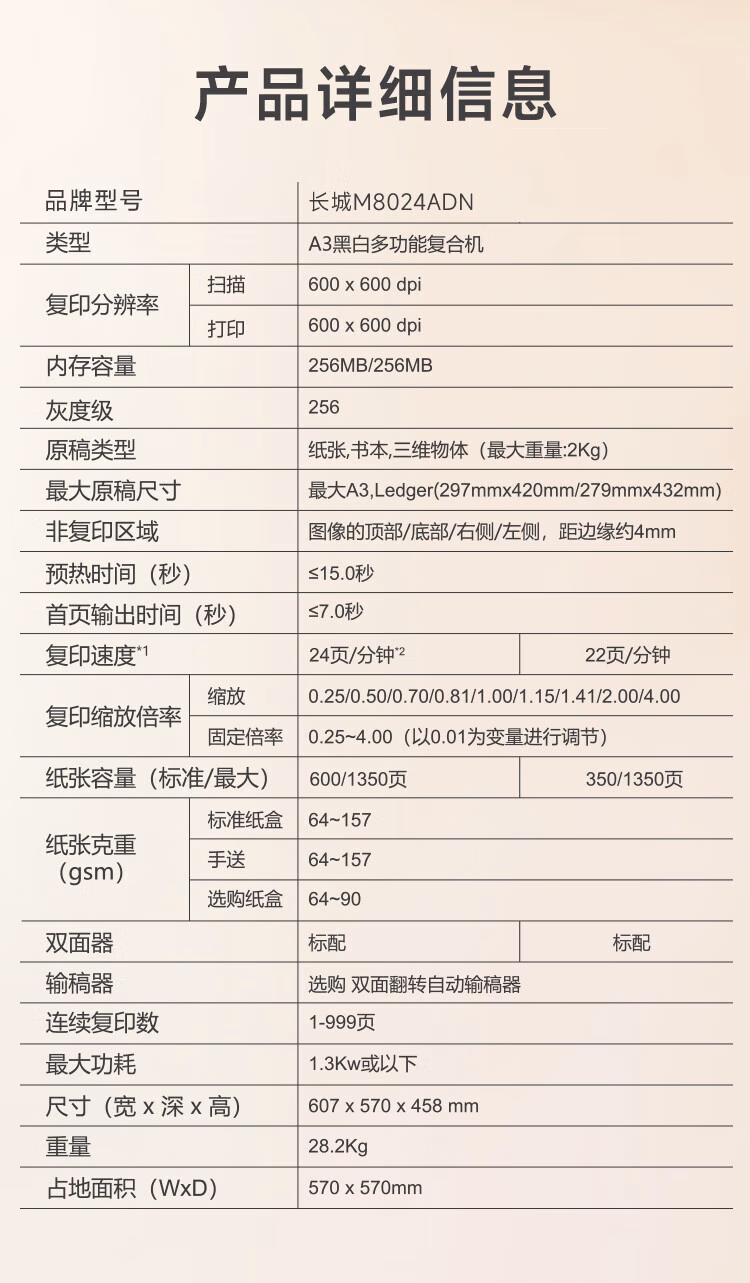 西安长城复印机M8024ADN M8024ADN 规格表 1.基本规格 类型 A3 黑白多功能复合机 复印分辨率 扫描:600600dpi 打印:600600dpi 内存容量 256MB/256MB 灰阶 256 原稿类型 纸张,书本,三维物体(最重:...